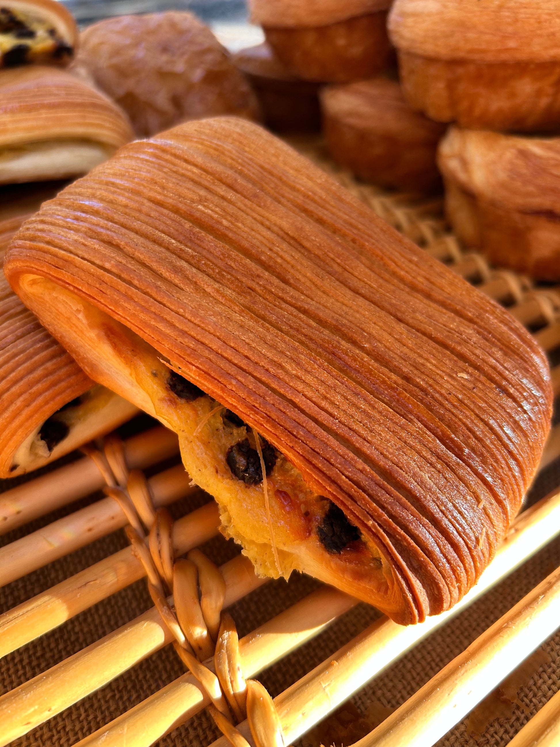 Sur une base de pâte à croissant striée, garni de crème pâtissière maison aux œufs frais et de pépites de chocolat.